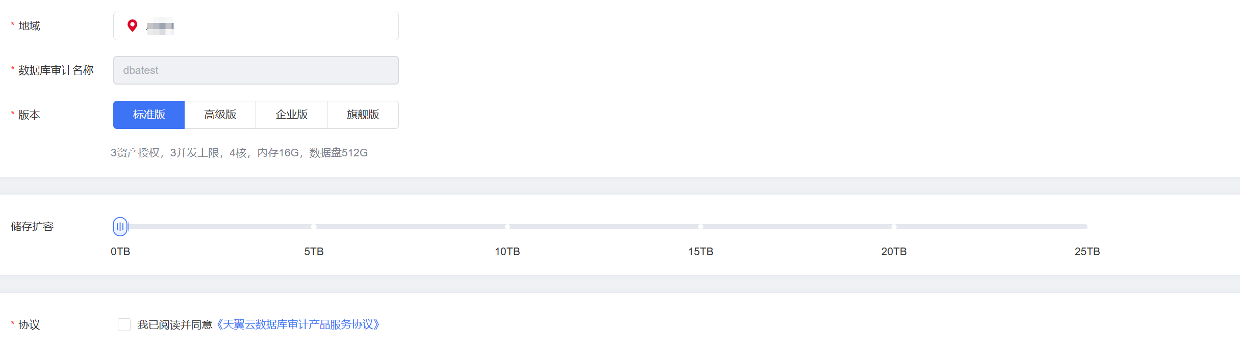 4.選擇完成后勾選“我已閱讀并同意《天翼云數據庫審計產品服務協議》”,單擊“提交”。