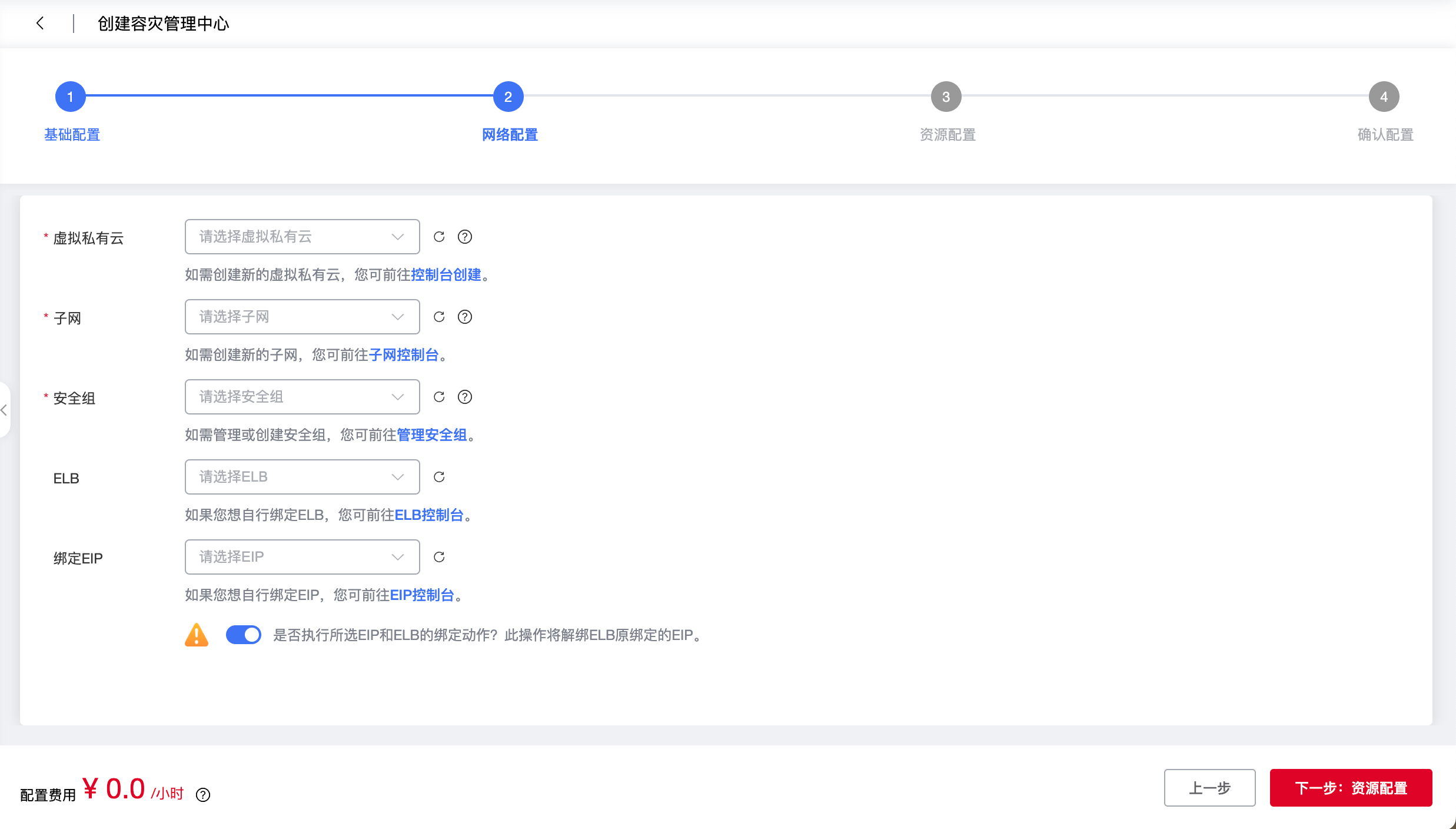 - 在【創建容災管理>網絡配置】頁面,根據您的具體業務需求選擇VPC、子網、安全組、ELB和EIP。如未事先開通云資源,可通過跳轉鏈接跳轉到對應產品頁面創建完成后返回本頁面繼續配置。