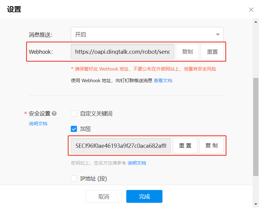 例如:Webhook地址為//oapi.dingtalk.com/robot/send?access_token=84baa7a8cd8408d98cd6cb69bf11eb1c0599d641b99af35b9811cde048371de7,則token為84baa7a8cd8408d98cd6cb69bf11eb1c0599d641b99af35b9811cde048371de7。 secret 復制的密鑰即為通知聯系組配置釘釘機器人所需的secret。 SECf96f0ae46193a9f27c0aca682aff86278365f7622b3e4cfe608be412e4cb31cb