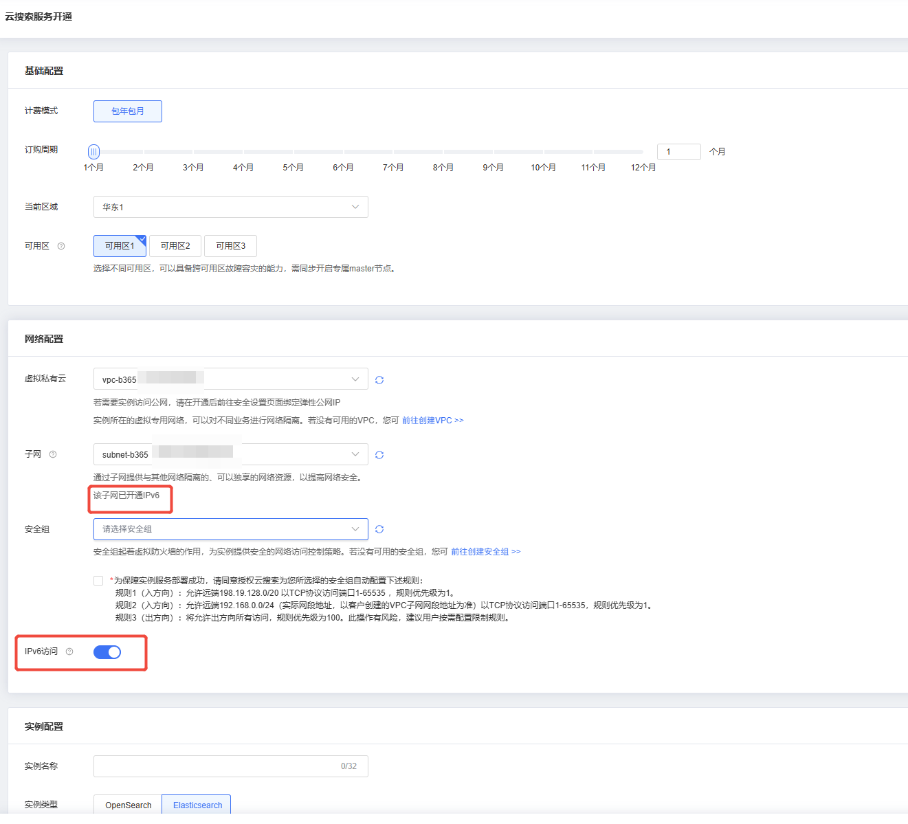 如果需要使用IPv6訪問,需要在開通虛擬私有云VPC時即選擇開通IPv6能力的子網,并在下單時選擇該子網,不支持實例開通后再升級IPv6。