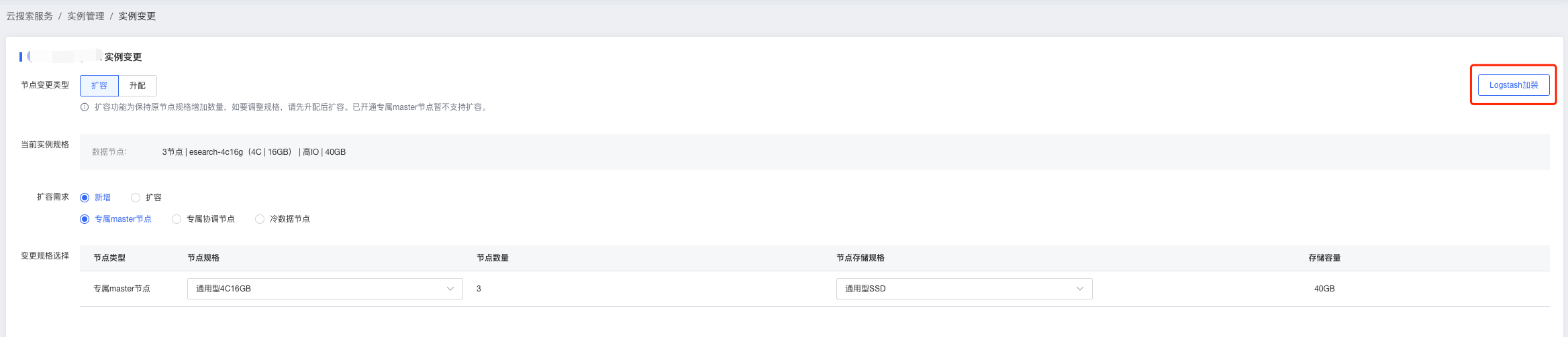 進入加裝入口:進入加裝的Elasticsearch或OpenSearch實例詳情中,選擇實例變更,在右上角選擇Logstash加裝,進入開通頁面。