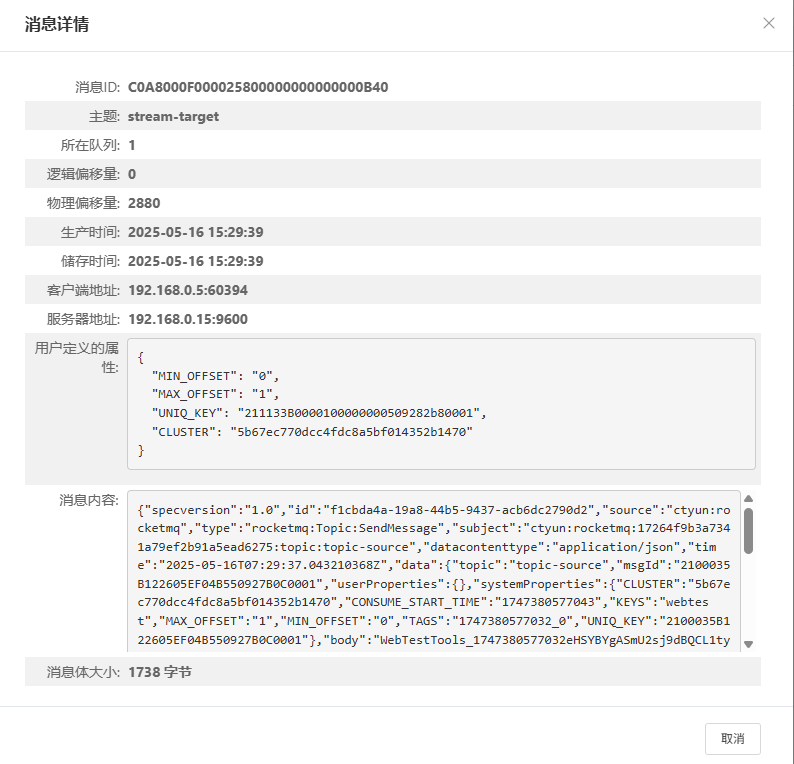 圖2 在分布式消息服務RocketMQ管理控制臺中查看消息詳情