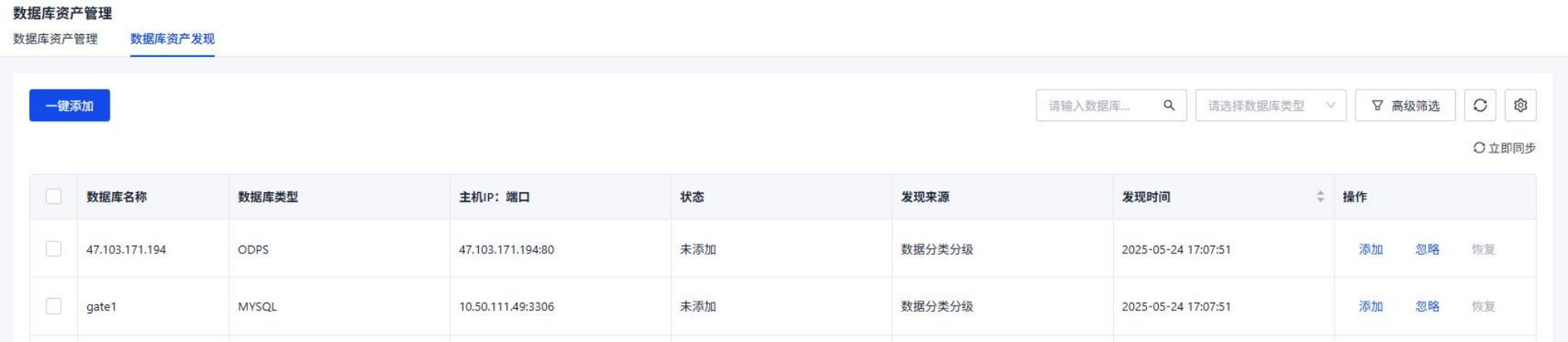 通過對接方式獲取的數據庫資產信息進入數據庫資產發現模塊中,通過添加的方式移動至數據庫資產模塊進行納管。
