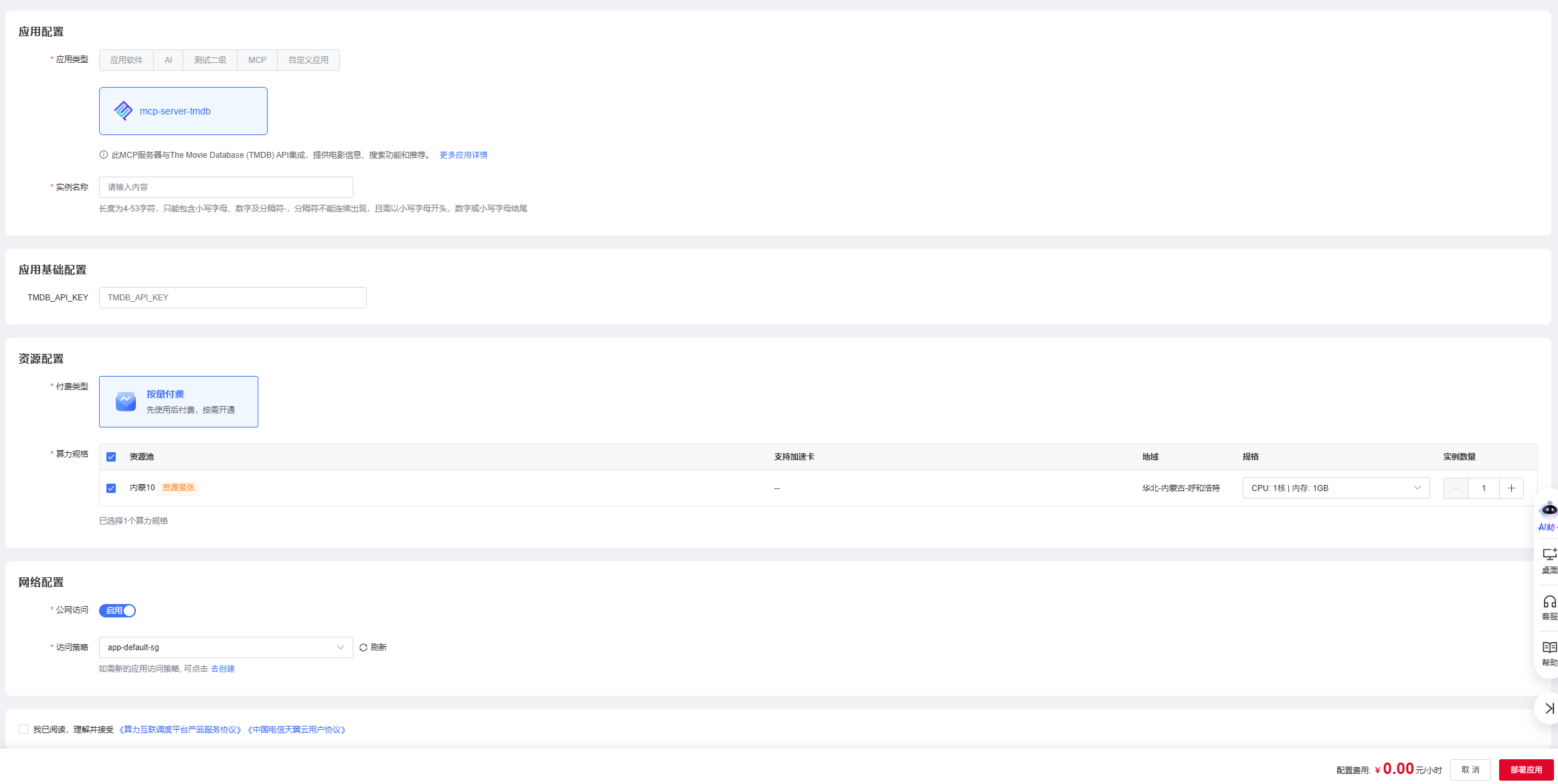 點擊【立即部署】,可再次部署該應用,填寫應用實例名稱、應用基礎配置信息,選擇算力規格與網絡配置,勾選服務協議,提交部署。
