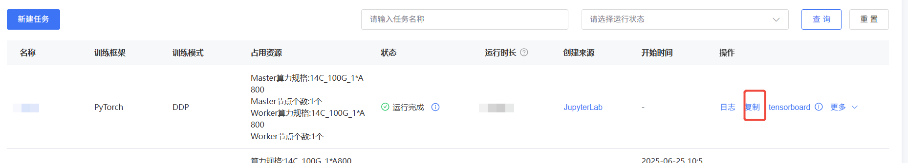 復制任務:如果已經創建了一個訓練任務可以在列表中點擊“復制”,復用該任務的配置和輸入參數創建一個新的訓練任務。