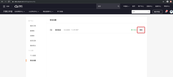 b) 安全設置:可設置/修改用戶身份,用戶身份分為個人學習用戶、中國電信員工、天翼云代理商,如下圖所示: