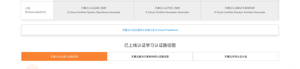 在首頁的導航欄和“職業資格認證”推薦板塊點擊后進入認證考試中心頁面,天翼云學堂所有已上線的認證考試都按照不同的分類用表格的形式展示出來,如下圖所示,其中認證考試名稱標灰色代表該認證任在籌劃中,其中認證考試名稱標藍色代表該認證即將發布。