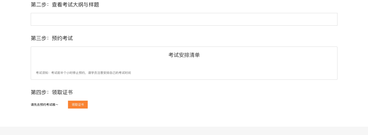 學員選擇一門認證考試后,進入該認證考試的詳情頁,認證詳情頁展示了考這個證書需要做的四個步驟,其中第三步是預約考試,第四步是領取證書。當你預約了一門考試之后,會有短信通知你預約成功,并且考試前24小時會短信提醒你考試時間,在線考試結束后可以實時查看考試是否通過,并領取證書。領取的證書可以在我的學習-我的認證-已通過欄目下進行證書下載。