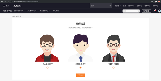 第一次進入天翼云學堂系統會跳轉至身份認證頁面,如下圖所以: