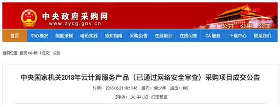 5月29日中央政府采購網發布《中央國家機關2018年云計算服務產品(已通過網絡安全審查)采購項目競爭性談判公告》,中國電信、華為、浪潮中標,此項中標結果適用于天翼云全國六大區域資源池(北上廣川蒙貴),此次中標結果意味著全國范圍內的政府和事業單位,150萬以內的采購可以直接簽訂合同,且中標范圍僅限通過網信辦安全審查的資源池。