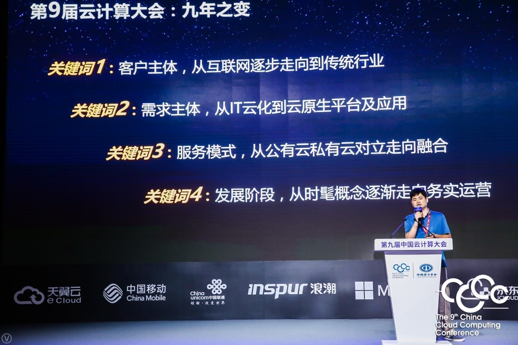 中國電信在2009年發布了云計算戰略,這九年過程中,云計算在中國經歷了巨大變化,第一是“客戶主體”的變化,云計算誕生之初更多是應用在互聯網公司、中小開發者、中小企業。如今,包括政務、教育、醫療在內的各行各業都開始使用云服務。第二是“需求主體”的變化,從IT的云化逐步轉變為云原生平臺及應用。從最初面向互聯網用戶的訪問發展到企業內部的IT系統的云化。第三是“服務模式”的轉變。即從公有云、私有云的對立逐步轉向融合發展的階段。第四個就是“發展階段”的變化。從一些時髦的概念逐步進入了務實階段。
